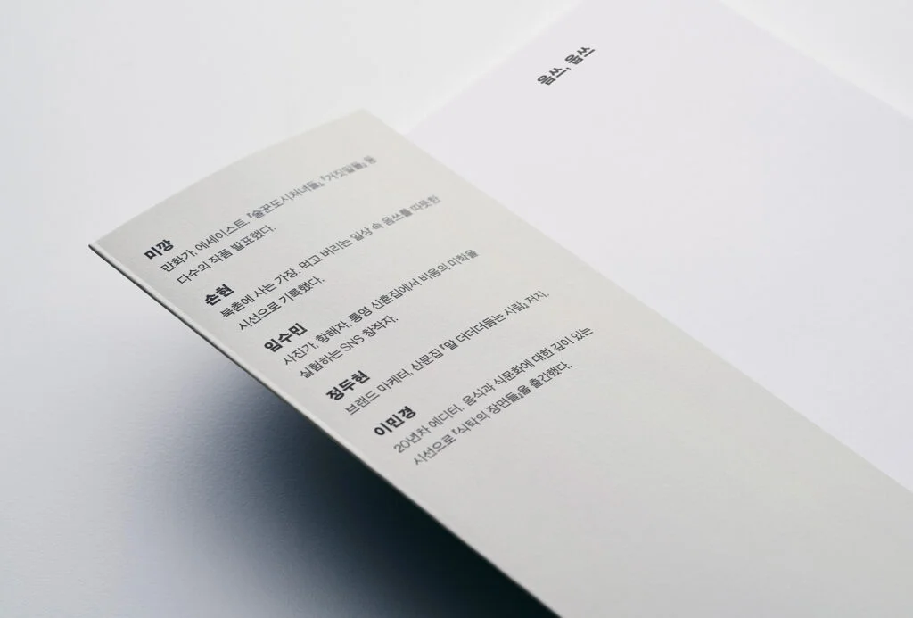 이 책에는 다섯 명의 창작자가 저자로 참여했습니다. 시선은 서로 다르지만, 공통적으로 음식과 삶, 그리고 ‘비움’의 감각을 깊이 탐구합니다.