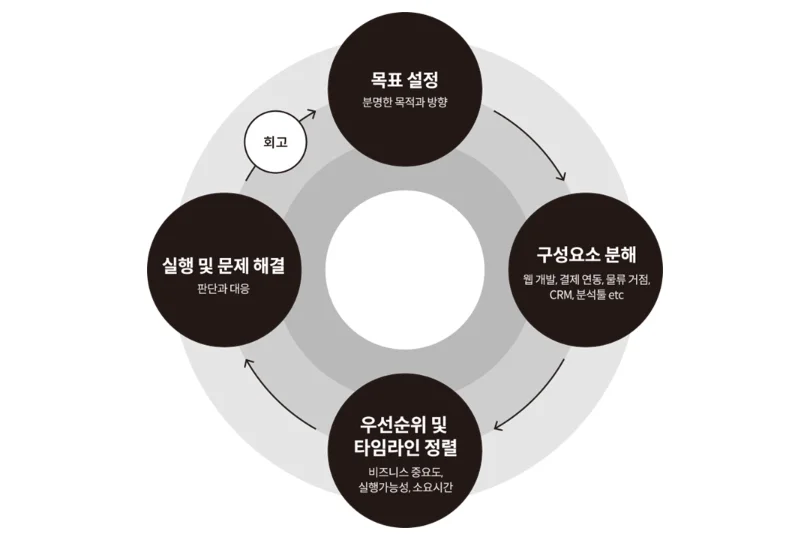 2. 대상을 구성요소로 분해한다 – 웹 개발, 결제 연동, 물류 거점, CRM, 분석툴 등 목표 달성을 위한 핵심 구성요소를 쪼갭니다.